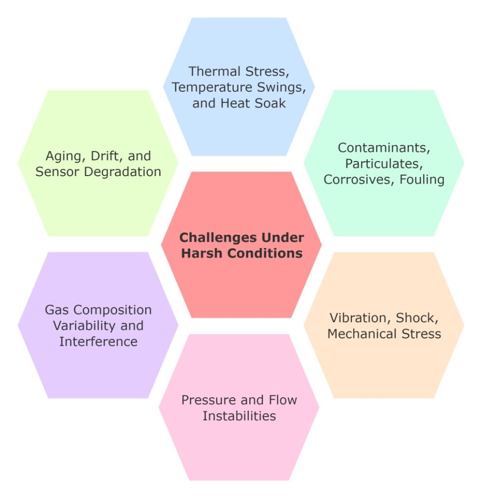 In a stable lab, you know exactly which species to measure. In real industrial gas, unexpected species or background fluctuations can hit you with cross-sensitivity errors. A sensor tuned for CO may respond weakly to hydrocarbons, or water vapor might quench fluorescence readings. In complex mixtures, you must design for interference correction, or include scrubbers or measurement of interfering species so you can mathematically compensate. Otherwise, your “corrected” value might be wrong.