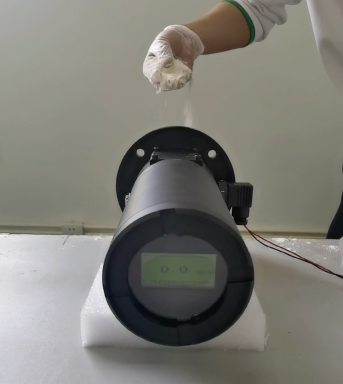 To understand how a dust monitor reacts in the field, we start with a simple real-world response test using simulated dust. In this test, we use a display-equipped laser dust monitor with a measurement range of 0–100mg/m3 and a fixed optical path of 0.5 m. A controlled amount of white powder is introduced into the optical path to mimic particulate matter in an emissions duct or stack. This setup mirrors how industrial optical monitors detect dust in exhaust streams.