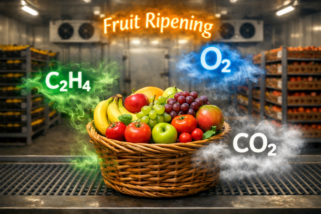 Fruit ripening is a gas-driven biochemical process, not a random event. BEthylene (C2H4) acts as the primary trigger, while oxygen and carbon dioxide regulate respiration. As fruits ripen, they release ethylene, which accelerates further ripening in a chain reaction . At the same time, fruits consume oxygen and release carbon dioxide, forming a dynamic gas environment that directly impacts quality and shelf life.