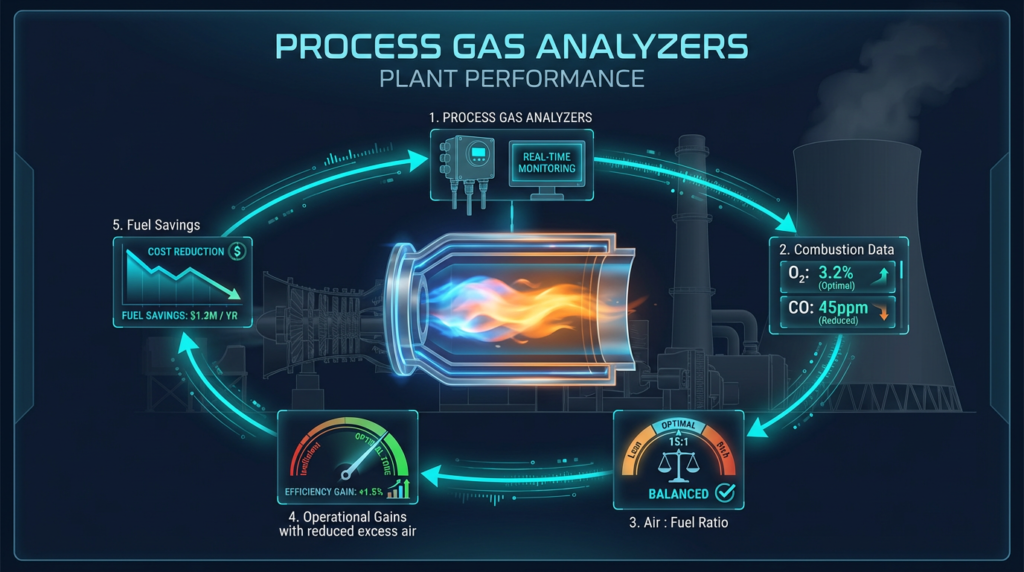 Process gas analyzers improve plant performance by turning combustion data into direct operational gains, because optimized air-to-fuel ratio reduces unnecessary fuel consumption, and even small improvements in excess air control can deliver measurable savings at scale, making fuel cost reduction one of the fastest and most visible returns on investment for power plant operators.