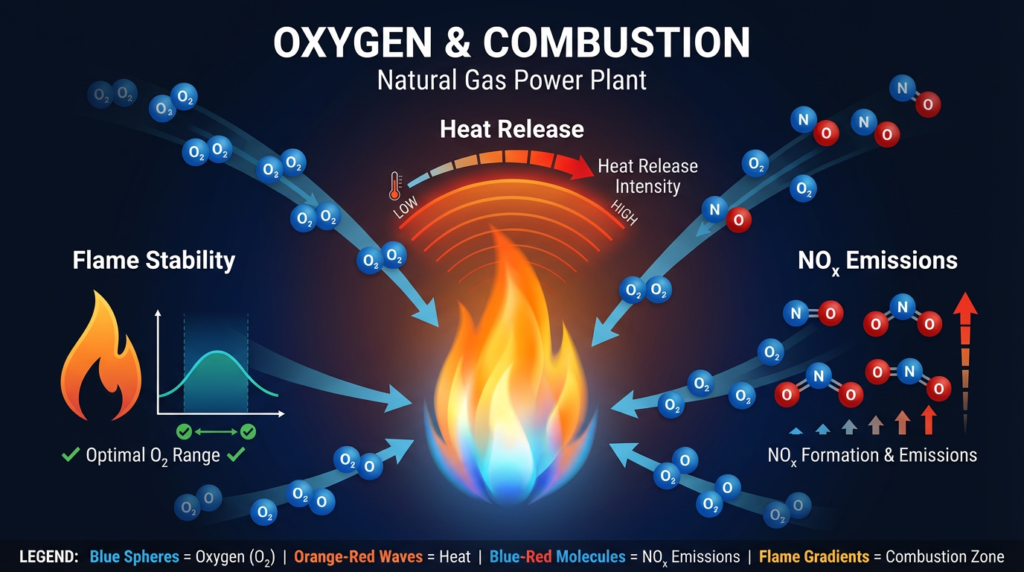 Oxygen works as the control knob of combustion in natural gas power plants because it directly defines the air-to-fuel ratio, which in turn determines flame stability, heat release, and emission formation, so operators do not really control combustion itself but instead control oxygen levels to influence the entire process, and this is why all effective combustion optimization strategies ultimately come down to precise oxygen control.