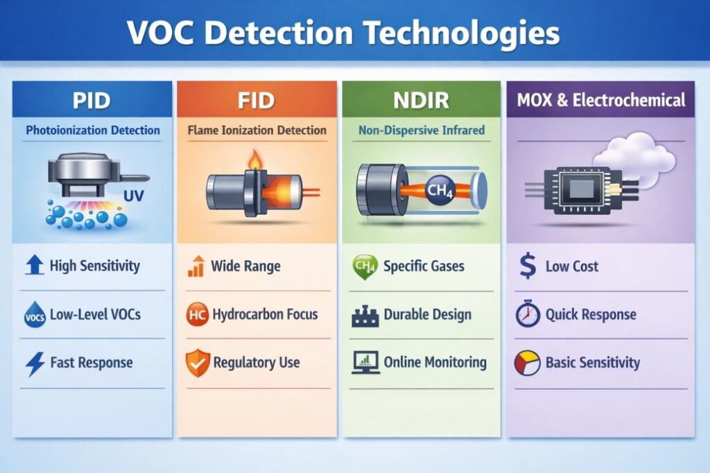- PID (Photoionization Detection) — high sensitivity for many VOCs.