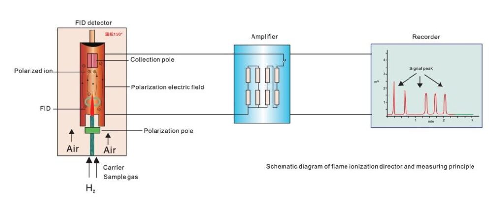 1) Hydrogen Flame Ionization Detection (FID) — When VOCs enter a hydrogen flame, the high temperature breaks their molecular bonds and generates free electrons. An electrical field draws these electrons toward a collector, generating an ionization current. The magnitude of this current is proportional to VOC concentration, allowing precise quantification of hydrocarbons. This linear response makes FID ideal for trace-level VOC monitoring in emissions and safety applications.